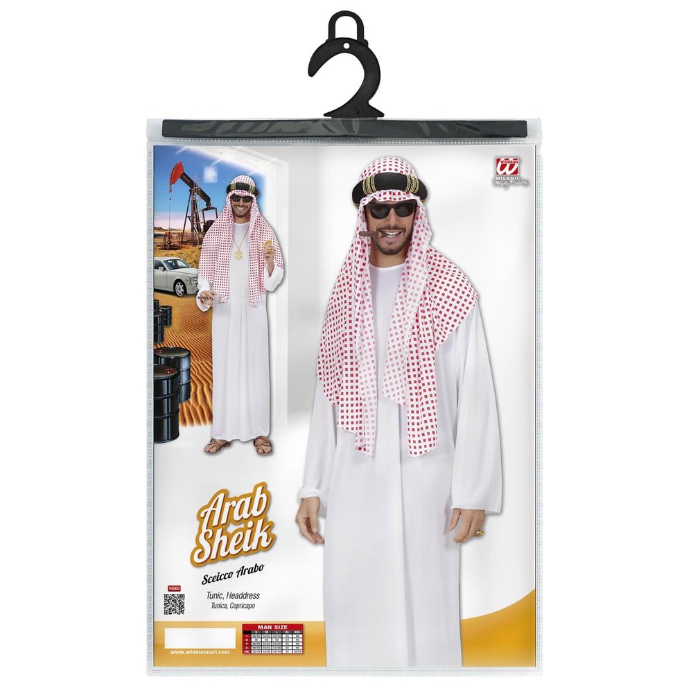 Superleuk wit sjeik kostuum met hoofddoek dat in twee maten te verkrijgen is. Dit superleuk sjeik kostuum is een gewaad met hoofdbedekking. Het gewaad van het superleuk sjeik kostuum is wit van kleur. Het hoofddeksel van het super leuke sjeik jelaba is rood wit geblokt. Het hoofddeksel van het superleuk sjeik kostuum wordt vast gehouden met een zwarte band. Koop een dollar ketting bij en uw mooie sjeik jelaba dan is het carnavalspak helemaal compleet.