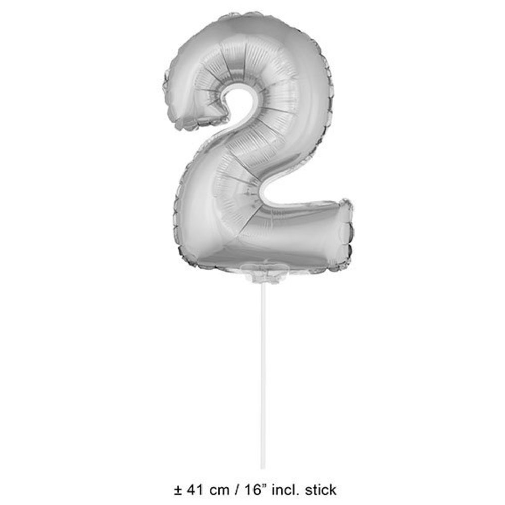 Leuke zilveren folie ballon cijfer 2 van ongeveer 41cm. De ballon kan door middel van een rietje worden opgeblazen. Het plastic stokje voor de bevestiging van de ballon wordt erbij geleverd.