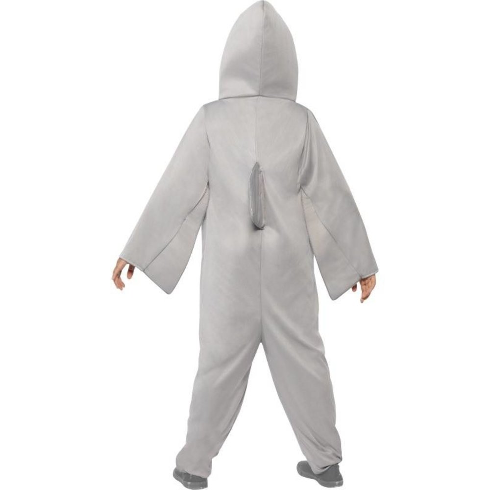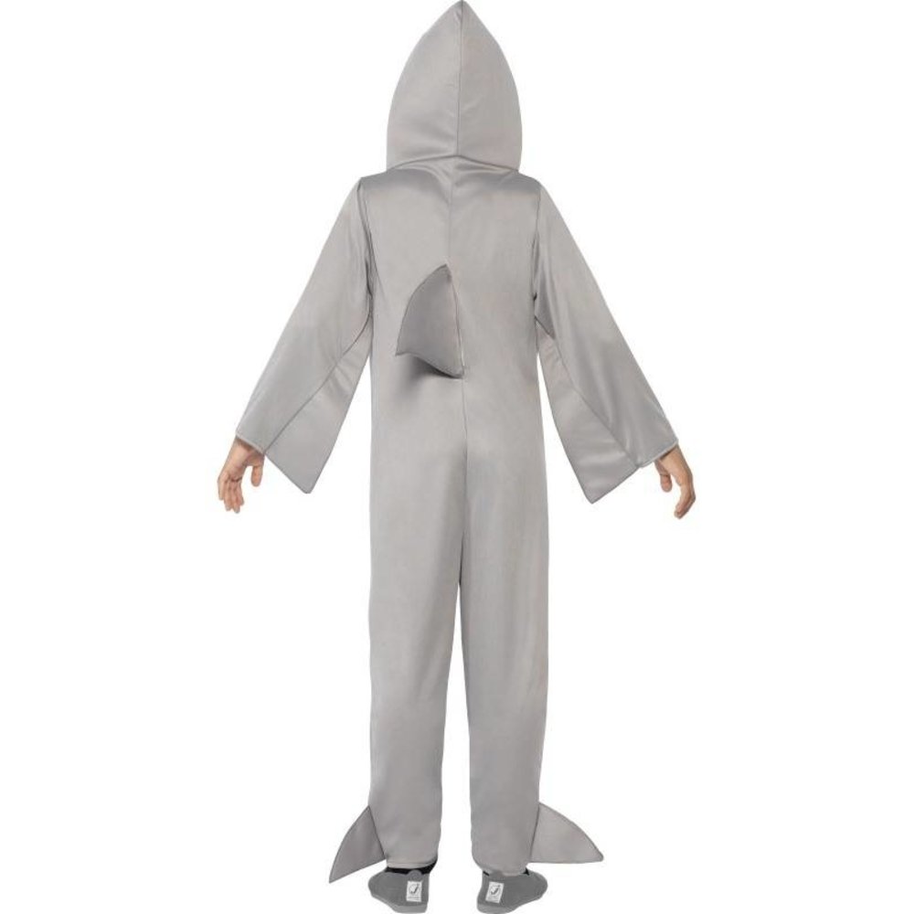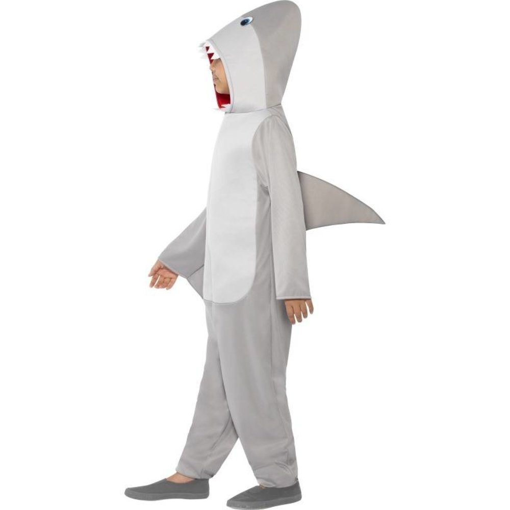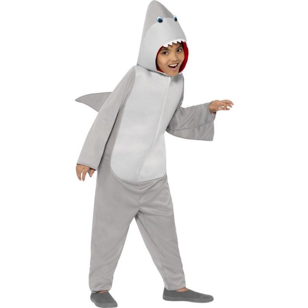 Grijs haaien kostuum voor kinderen omvat de jumpsuit met haaien muts