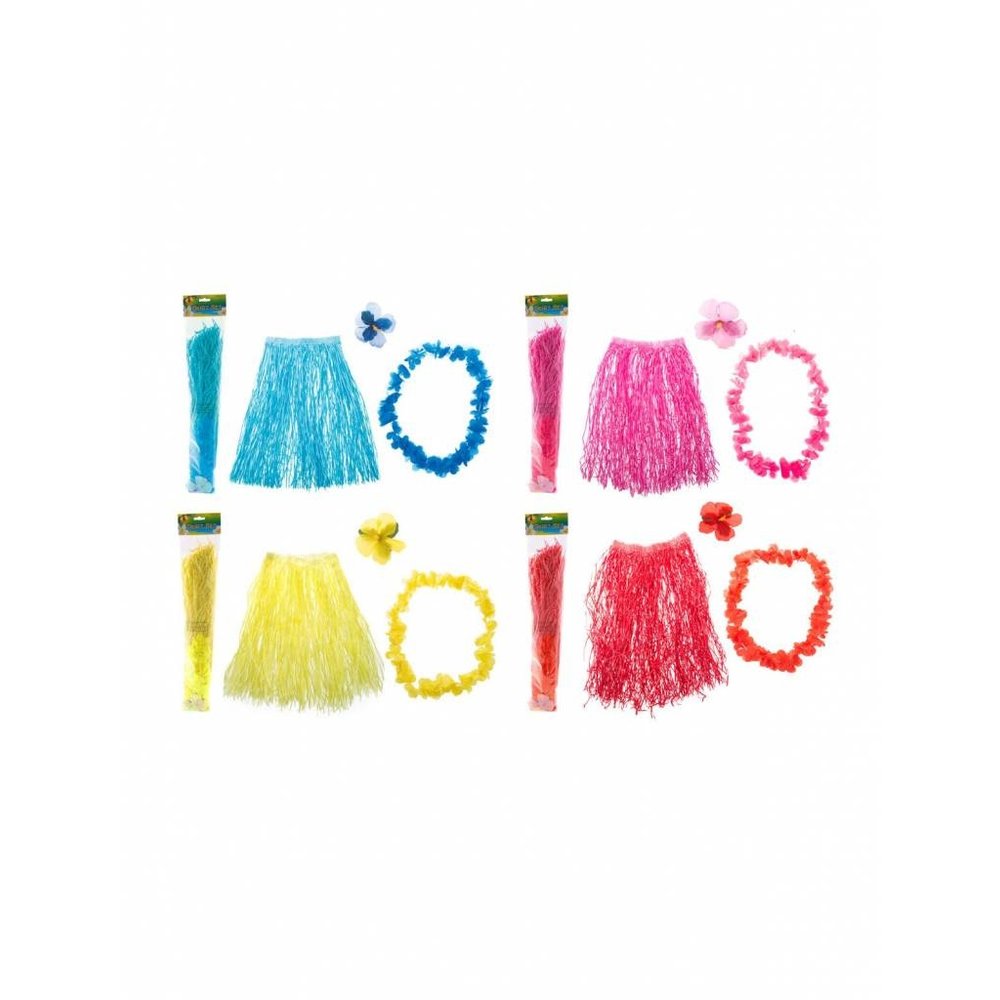 Mooie Hawaii verkleed set in de kleur blauw. Hawaii rok is 60cm lang. Hawaii set omvat de rok, bloemenkrans en haarclip.