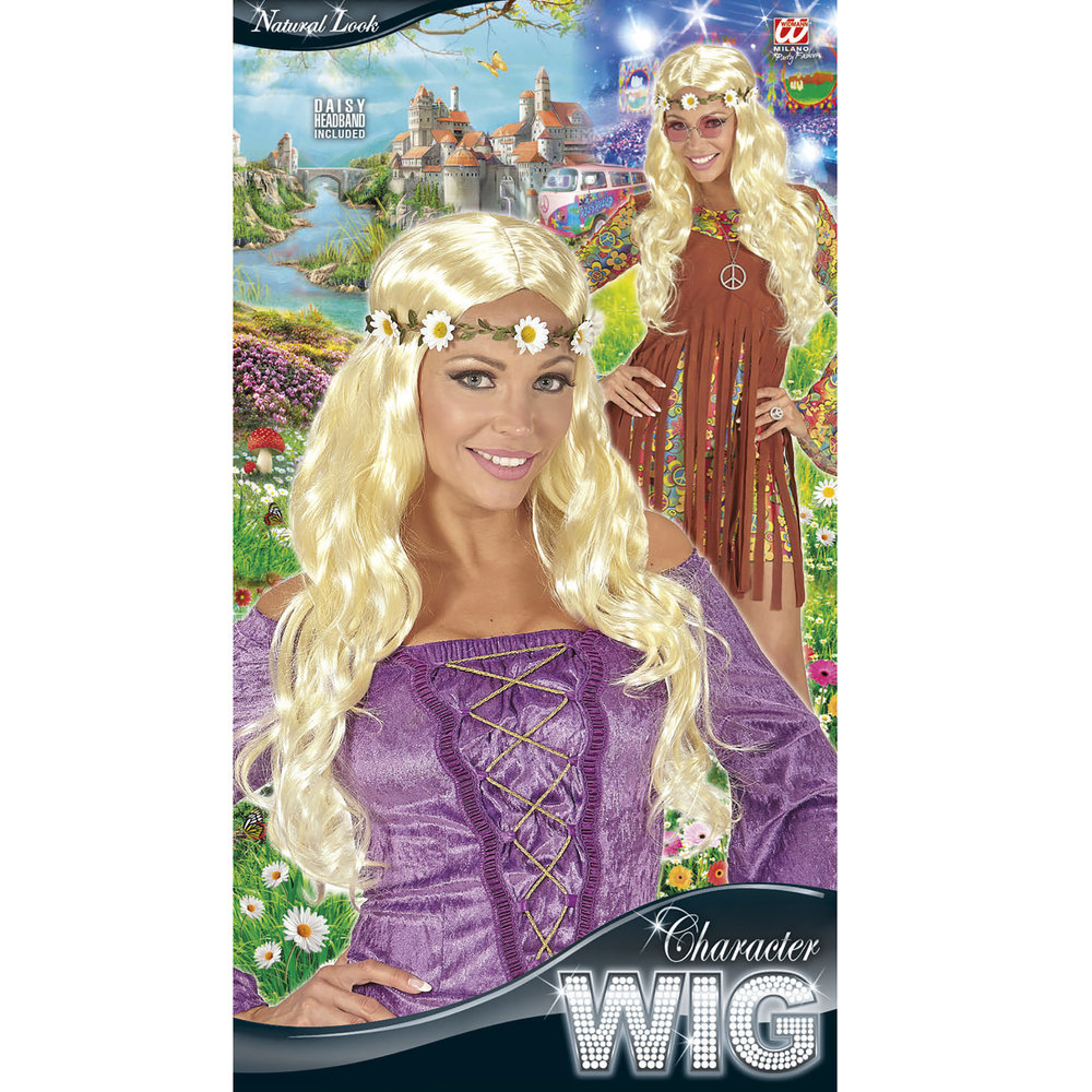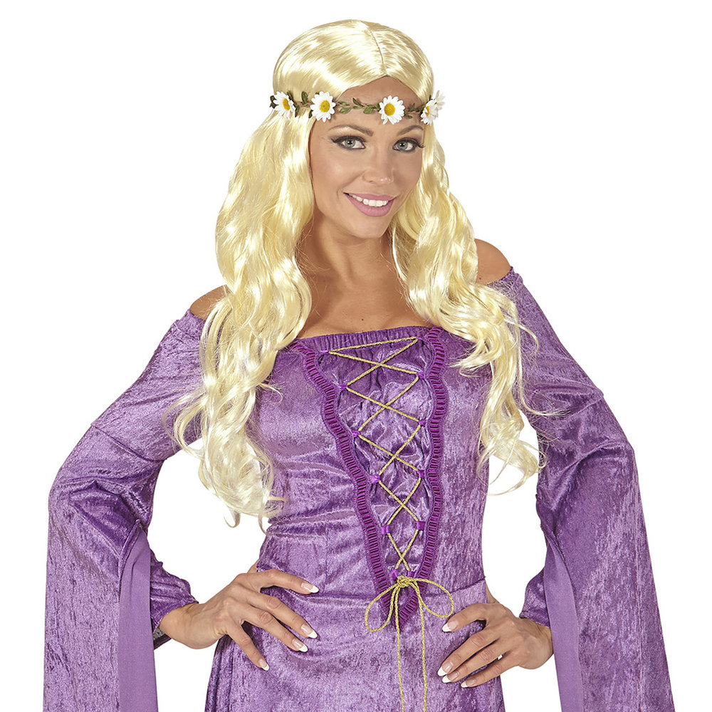 pruik, hippie/ middeleeuwen blond met bloemen hoofdband